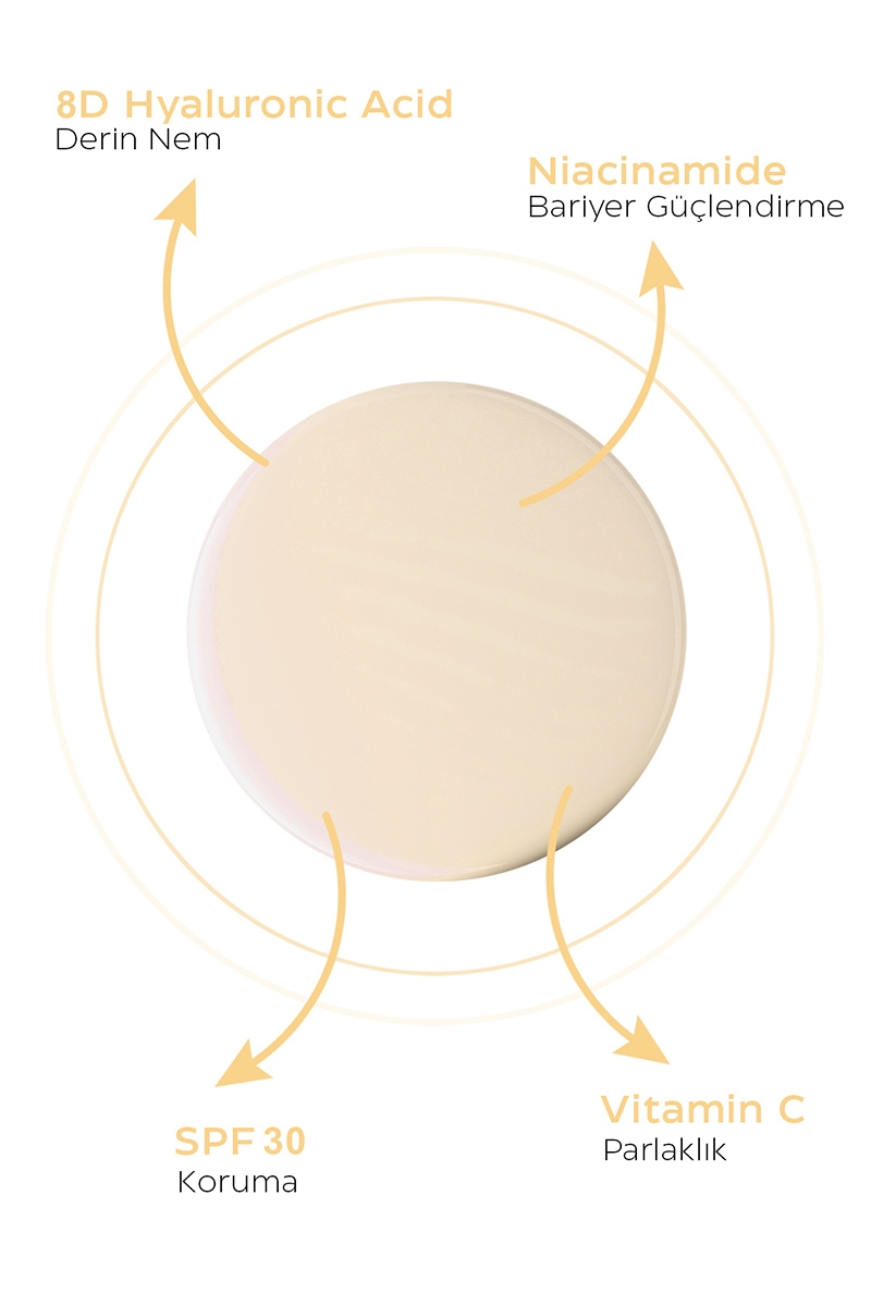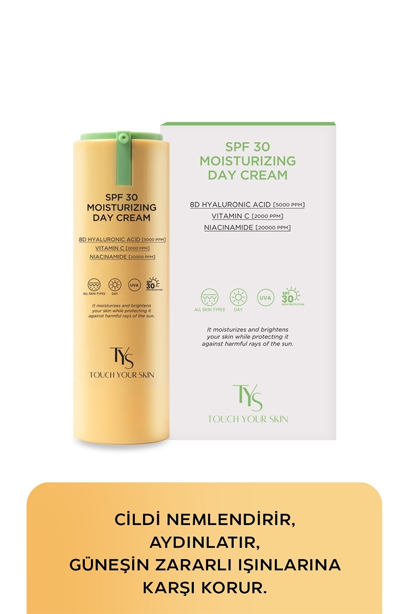 Touch Your Skin SPF 30 (Yüksek Koruma) Nemlendirici Gündüz Kremi cildinizi zararlı UV ışınlarına karşı korumaya yardımcı olurken; 8D Hyaluronic Acid, Vitamin C ve Niacinamide içeren formülüyle cildinizin nem dengesini korur, cilt tonunuzu eşitler ve cildinize aydınlık bir görünüm sağlar.
