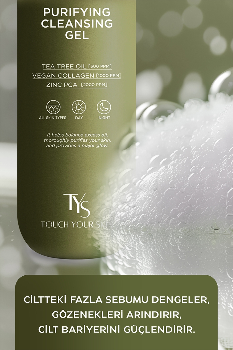Cildinizin doğal nem dengesini koruyarak kir ve yağı nazikçe arındırın. Tea Tree Oil, Zinc PCA ve Vegan Collagen içeren Touch Your Skin Arındırıcı Temizleme Jeli, cildinizi derinlemesine temizlerken, ciltteki fazla yağı ve kiri uzaklaştırır. Cildin elastikiyetini artırarak sağlıklı bir görünüm elde etmenize yardımcı olur. Ferahlatıcı dokusu, her kullanımdan sonra taze ve ipeksi bir cilt hissi sağlar.